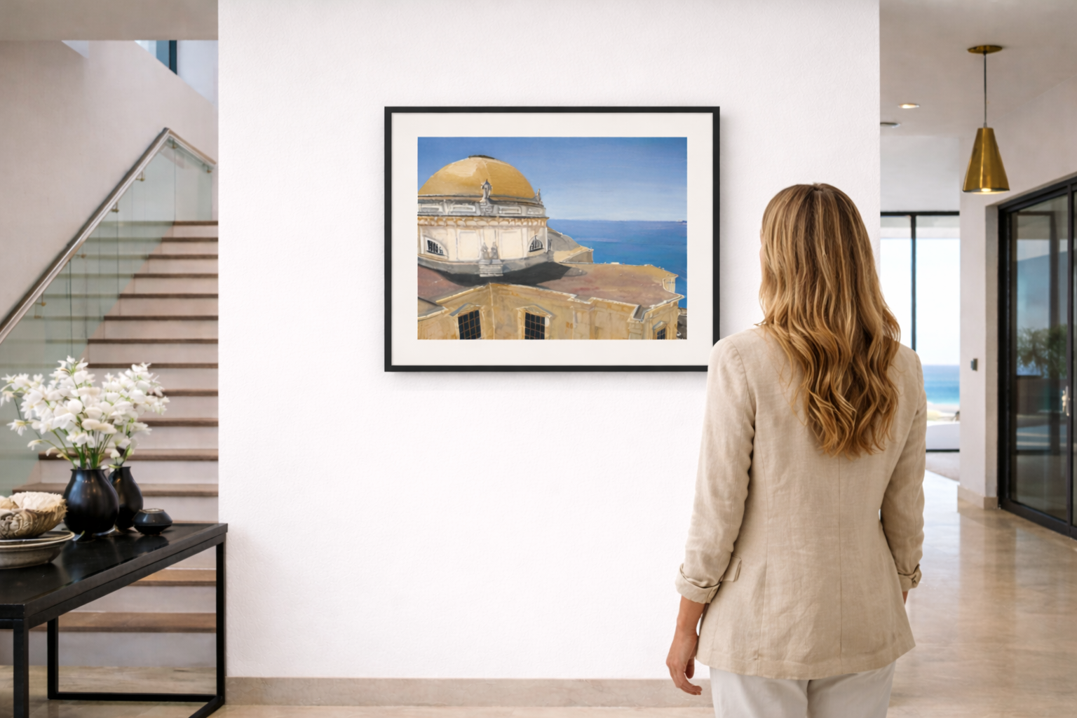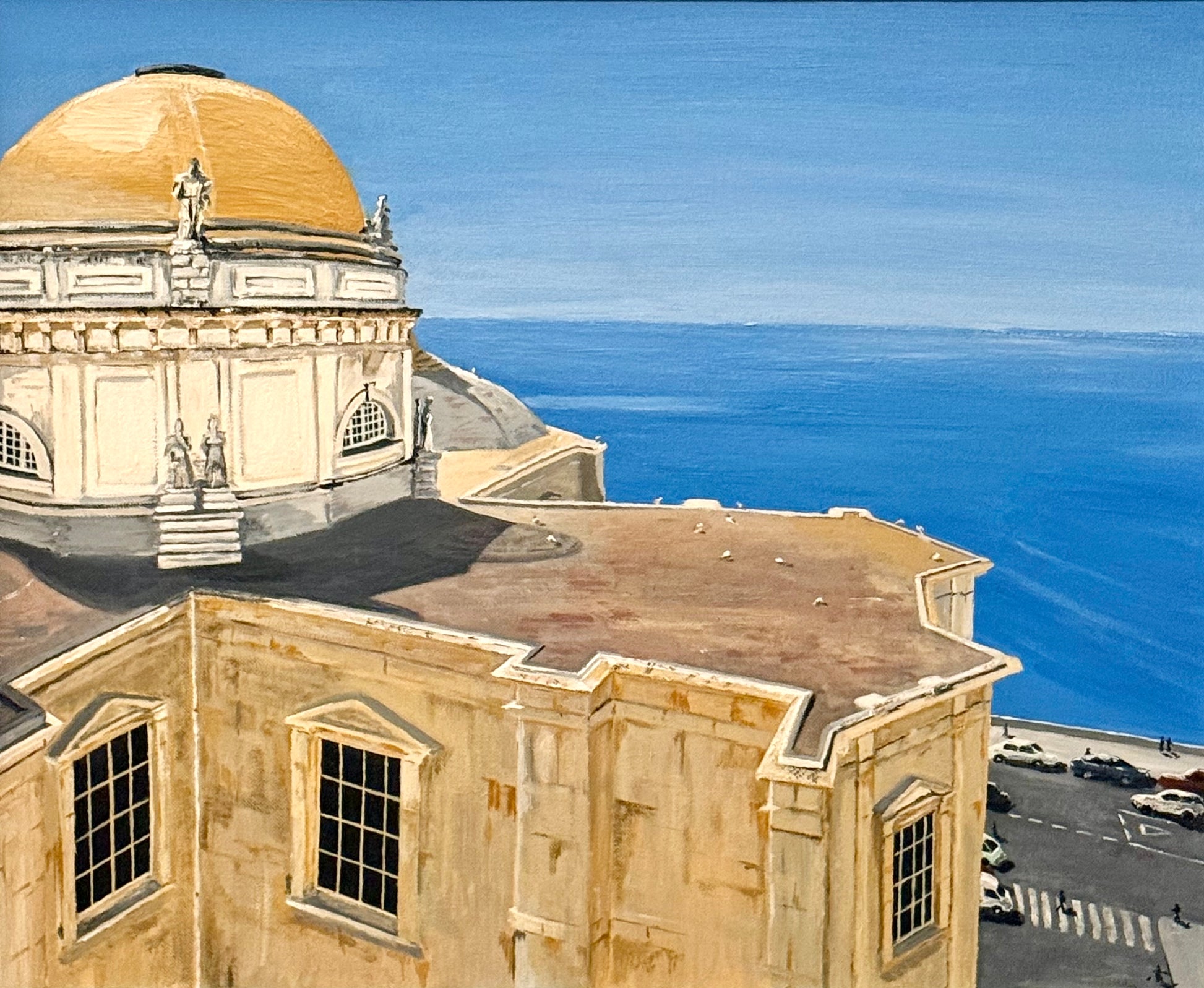El contraste entre los ocres envejecidos por la sal y los azules densos del océano es especialmente acertado: Cádiz no se entiende sin ese desgaste noble, sin esa pátina de historia expuesta al viento y al tiempo. La pincelada suelta pero segura encaja con la idea de una ciudad vivida, no idealizada. El horizonte bajo y amplio subraya el carácter atlántico: aquí no hay encierro, hay apertura. La catedral no se alza solo como templo, sino como testigo de siglos de partidas y llegadas, de promesas hechas al mar, de oraciones pronunciadas antes de embarcar. En tu obra, la cúpula no domina el océano: lo escucha.