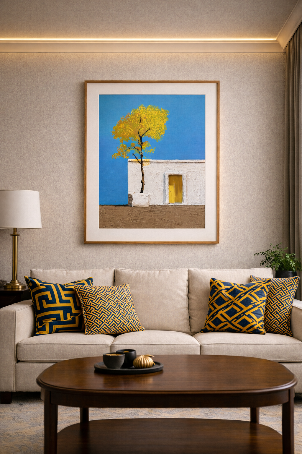 Un cielo profundamente azul, una fachada blanca de textura rugosa, un árbol dorado que parece abrazar el silencio… y una puerta amarilla que sugiere misterio y acogida.